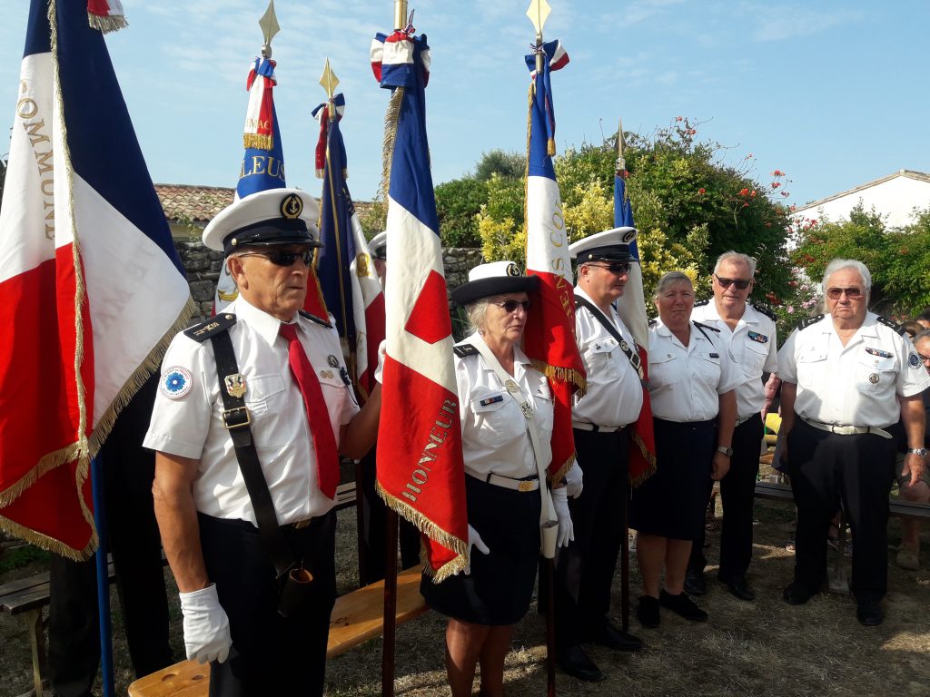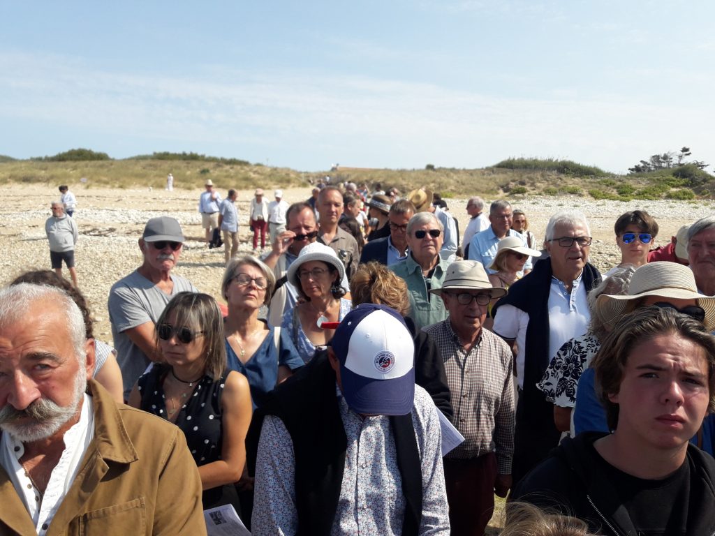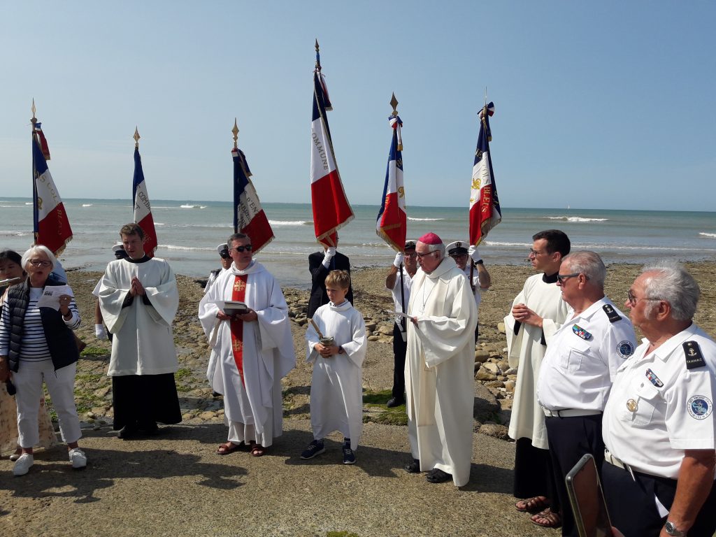 Puis un imposant cortège, entouré des drapeaux de la délégation de l’Amicale des Anciens Cols Bleus et des Anciens Combattants se rend jusqu’à la mer pour la bénédiction des flots par Mr le Curé, accompagné cette année par Monseigneur Philippe MOUSSET, évêque de Périgueux et de Sarlat.